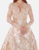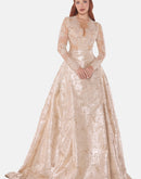 Champagne jacquard gown with a French lace bodice and long sleeves. Soft structured skirt with natural volume and a subtle luminous finish.