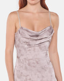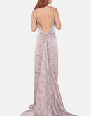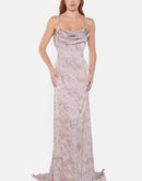 Light silver-grey gown featuring a softly draped cowl neckline and an open back. The fluid fabric enhances the natural movement of the body, flowing into a delicate train that adds grace and sophistication.