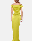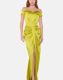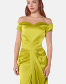 A striking lime satin dress designed with an off-shoulder neckline and a beautifully draped front. The fitted silhouette falls into a long skirt with a high front slit, adding movement and a confident, elegant finish.
