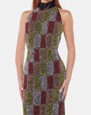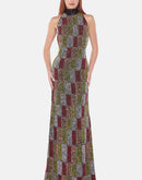 A statement gown fully embellished with multicolor sequins, designed in a sleek halter silhouette with an open back. The heavy, fluid fabric creates a luxurious drape and effortless movement, reflecting light with every step.