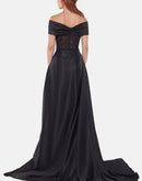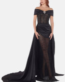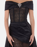Black off-shoulder gown crafted entirely from delicate lace, featuring a structured corset bodice and a mini-length front that flows into a dramatic satin train. Accented with a signature brooch for timeless sophistication.