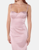 A sleek blush satin dress designed with delicate straps and softly shaped bust detailing. The silhouette is fitted and elegant, falling into a straight long skirt with a subtle back slit for comfortable movement. The low back adds a refined, feminine touch while keeping the look minimal and sophisticated.