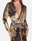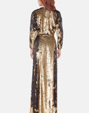Full-length gown crafted from reversible gold sequins that shift to black with movement. Designed in a wrap silhouette with an embellished waist and red velvet lining for a bold, luxurious finish.